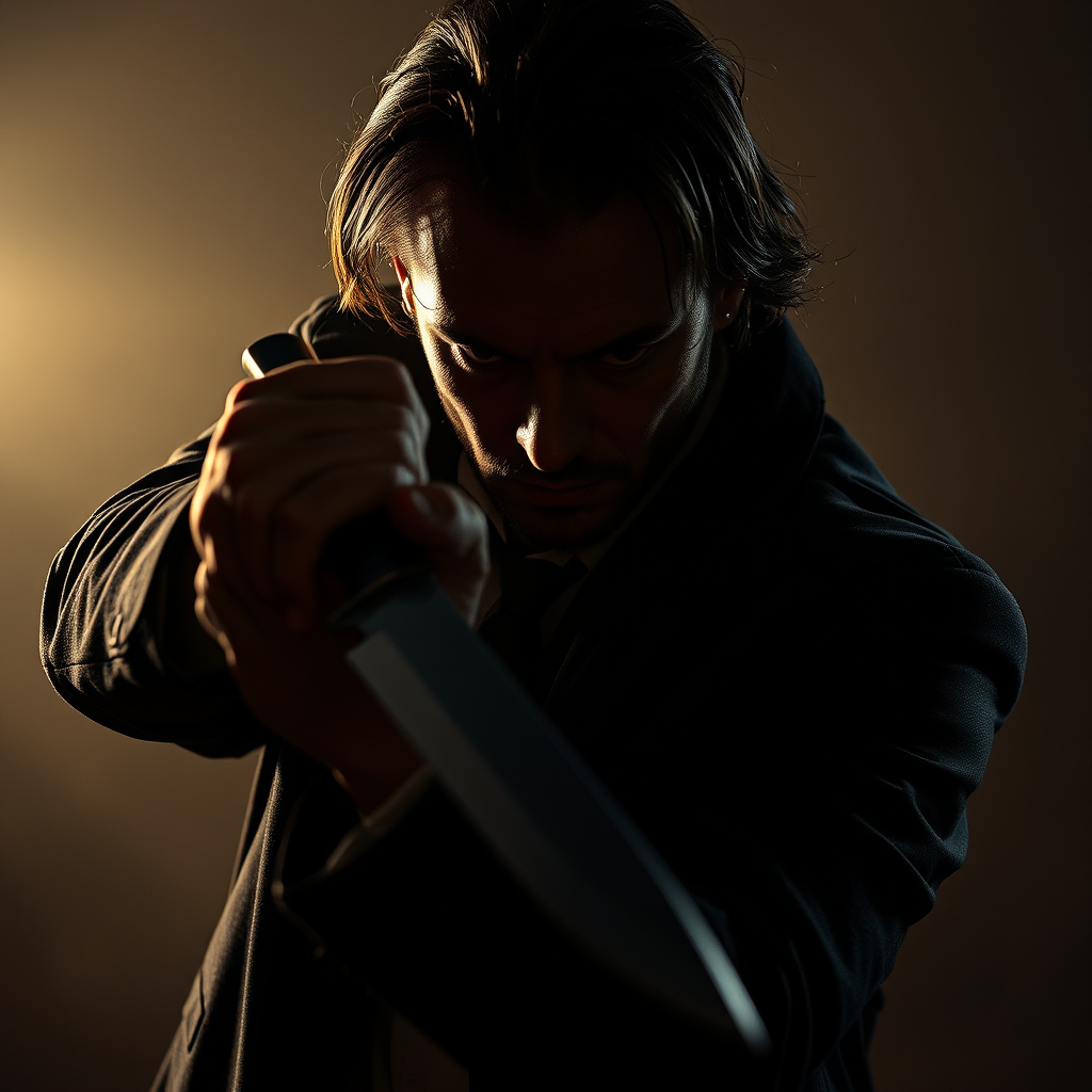 A cinematic portrayal of a man embodying an assassin, intricately poised with a knife in hand, bathed in dramatic light reminiscent of Rutkowski's signature style, with an artful depth of field that enhances the scene's tension, as if captured through the lens of a master in Lightroom.