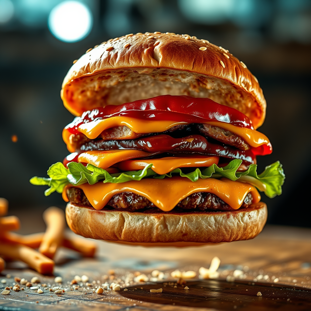 A cinematic portrayal of a succulent burger deconstructing mid-air, each layer glistening with juices and vibrant with flavor; the intricate details are captured with an HDR effect that brings out the richness of every ingredient. Enhanced with Adobe Lightroom's precision, this highly detailed promotional image presents the hot, mouthwatering essence of a perfect burger in motion, each element meticulously highlighted to entice and captivate.