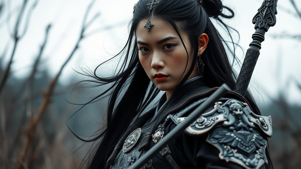 A cinematic portrayal of an ancient Fu Hao warrior standing vigilant in an enigmatic woodland setting; she possesses long flowing black hair and a light fair complexion. Her battle attire is exquisitely detailed, showcasing an array of finely crafted weaponry with intricate designs. The scene is bathed in delicate natural lighting, accentuating the overcast sky and creating a moody yet photorealistic atmosphere. Captured in high-definition 8k resolution with an octane rendering style, the focused frame emphasizes her determined expression and the textures and shadows of her intricately designed armor, offering a hyperrealistic glimpse into a historical realm.