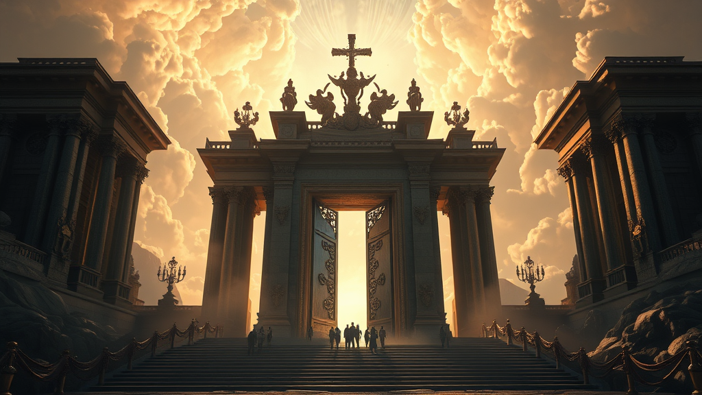 A cinematic portrayal of the gates to heaven, intricately detailed in 8k resolution, featuring an atmospheric blend of realism and fantasy art. This scene is influenced by the styles of Ivan Aivazovsky, Peter Mohrbacher, and Greg Rutkowski, enhanced with a volumetric light effect and broad, ethereal illumination. The composition echoes the grandeur of oil painting, combining elements of both sci-fi and realism, capturing the essence of divine transcendence. It is a masterpiece worthy of premium prints, rendered with the sophistication of Unreal Engine, offering an otherworldly yet realistic vision of paradise's entrance.