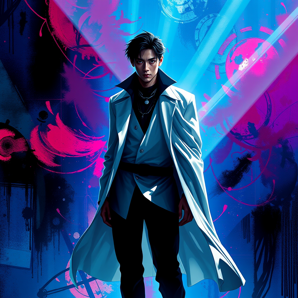 A cinematic poster featuring a male character draped in sleek shades of black, white, and blue, with an emphasis on light interplay, inspired by the intricate and dynamic style of Yoh Nagao. The character stands amidst an abstract, vibrant backdrop where light beams and shadows dance across the scene, highlighting the contrasts and creating a sense of movement. The overall composition suggests an aura of mystery and depth, inviting viewers into a world of artistic exploration and intrigue.