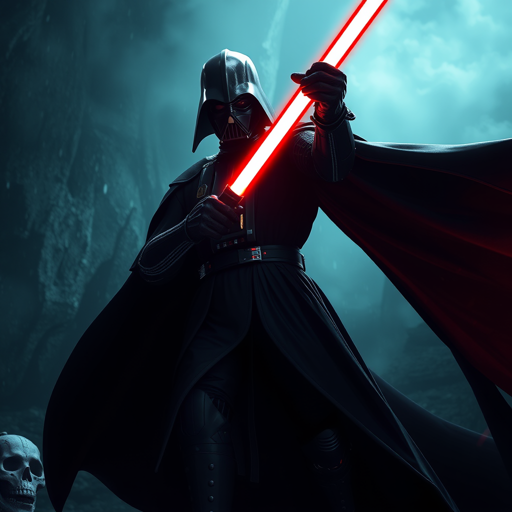 A cinematic poster showcasing a Sith Lord in a dynamic pose, full body shot against a moody backdrop, captured with a wide-angle lens in sharp focus. The artwork is a hyper-detailed, beautifully color-graded masterpiece, reminiscent of concept art, with intricate details highlighted by volumetric lighting. The use of natural and studio lighting creates a mesmerizing balance of shadows and highlights, enhanced by ray tracing reflections and ambient occlusion. The scene is bathed in a mix of incandescent and optical fiber lighting, adding depth and a mystical glow. Contre-jour and accent lighting techniques emphasize the imposing figure, with beautifully executed global illumination and screen space reflections. The environment is alive with atmospheric effects like scattering and shimmering. This ultra-realistic digital art combines elements of CGI, 3D, and illustration, achieving a super-detailed, richly colored, and high-contrast visual result, invoking elegance and intricate maximalist design without compromising on quality or detail.
