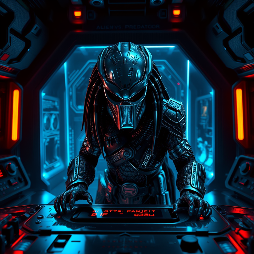 A cinematic rendering of a Predator from Alien vs Predator, depicted in a futuristic hologram at a control panel with intricate details. The scene showcases a hyper-realistic portrayal of the Predator, with glistening textures and a dark, atmospheric setting inside a spaceship. The hologram emits a subtle blue glow, contrasting against the shadowy environment. Hidden details are woven throughout the scene, inviting a closer look. The high dynamic range captures the depth and texture of both the Predator and the technological display, creating an immersive experience. The wet surfaces within the spaceship reflect the ambient light, enhancing the realism. Despite the complexity and detail, the scene remains clear and sharp, avoiding any artifacts or distortions, with a focus on maintaining the integrity of the futuristic and cinematic essence.
