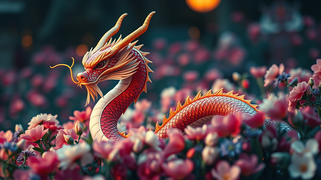 A cinematic scene captures a Chinese dragon with a snake-like, elongated body gracefully coiled amid a sea of vibrant flowers. Its scales shimmer with stunning colors, accentuated by majestic horns that add to its mythical presence. The traditional Chinese aesthetic is evident, presenting a legendary creature in an exquisite, highly detailed frame. The shallow depth of field, combined with a subtle vignette, brings focus to the dragon's majestic form. The image embodies a high-budget production feel, with bokeh effects and a cinemascope aspect that enhances its epic, moody atmosphere. Artistic elements contribute to its allure—film grain mingles with anime-like graphics, giving it an abstract yet captivating visual texture.