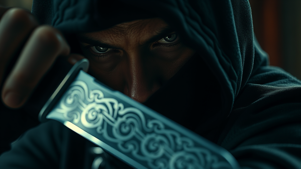 A cinematic scene captures a skilled male assassin cloaked in shadows, the glint of a knife reflecting intricate patterns reminiscent of Rutkowski's artistry. The depth of field focuses sharply on his determined gaze, while the softened background heightens the tension. The masterful use of Lightroom illuminates the scene, casting dramatic contrasts of light and shadow, accentuating the assassin's stealthy presence and leaving an air of impending action.