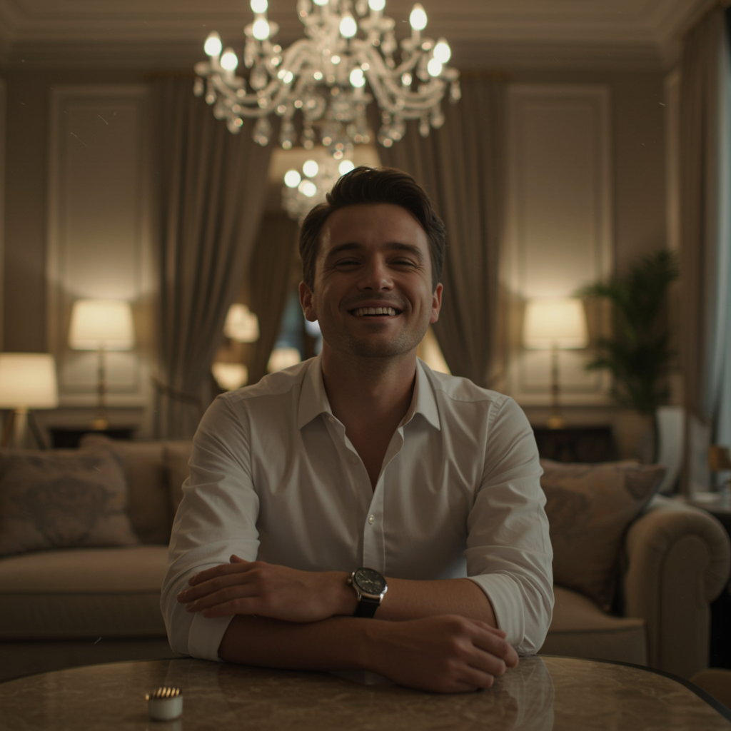 A cinematic scene depicting a delighted client basking in the luxurious atmosphere of a beautifully designed interior, filled with elegant furnishings and soft, ambient lighting, capturing their genuine satisfaction and appreciation for the exquisite design service they've received, framed in a painterly style with rich brush strokes and vibrant colors.