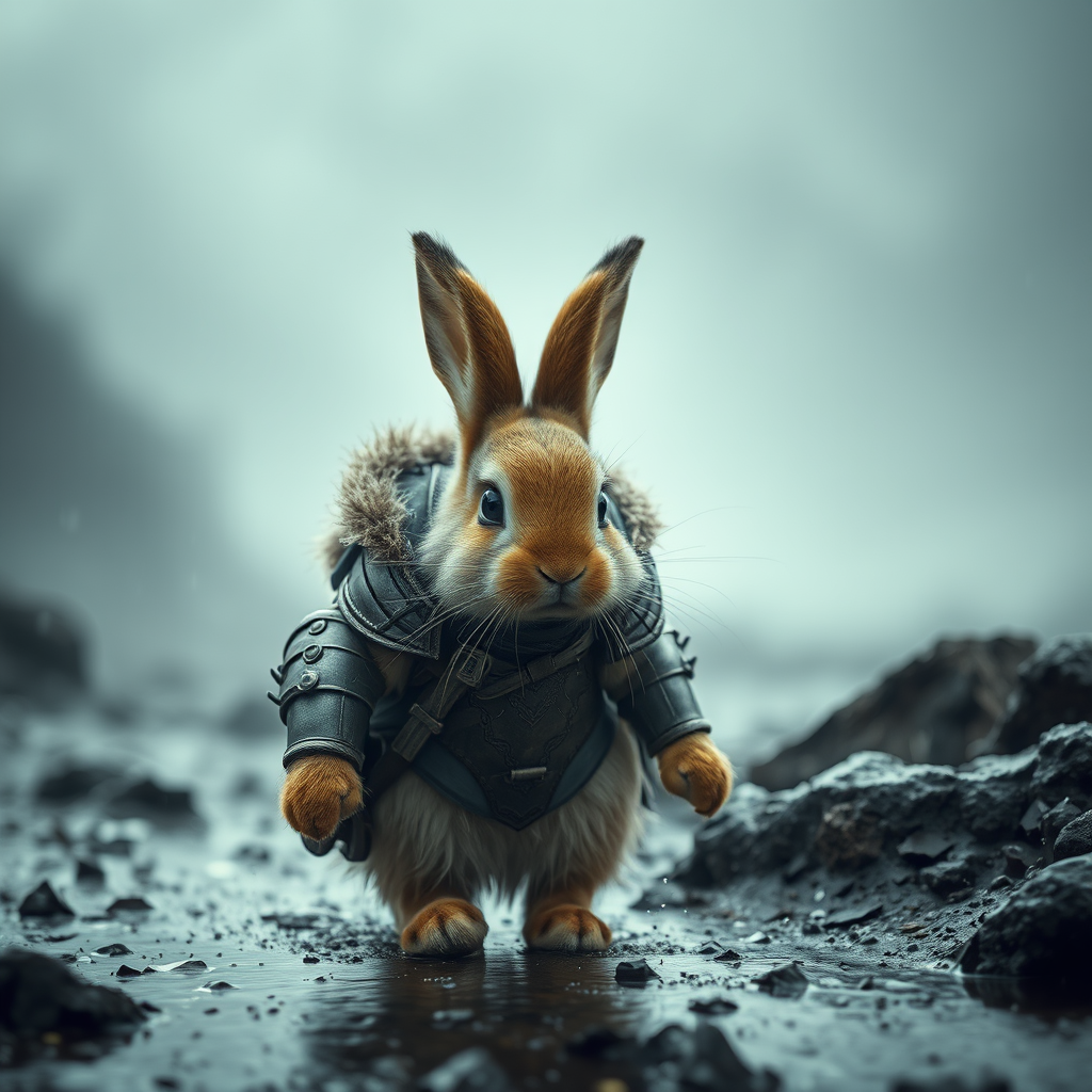 A cinematic scene featuring a bunny in intricately designed light armor with fluffy fur, navigating through a foggy and wet storm. The atmosphere is intense and dramatic, captured with a 70mm lens to emphasize fine details. The setting evokes a sense of adventure and mystery, highlighting the contrast between the delicate features of the bunny and the rugged environment.