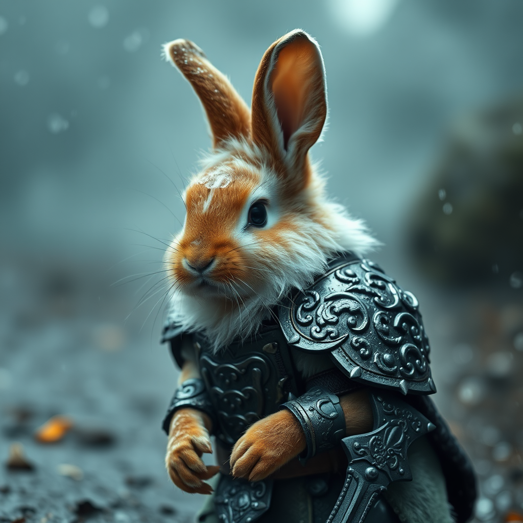 A cinematic scene featuring a bunny in intricately decorated light armor, its fluffy fur slightly damp from the foggy, stormy environment. The atmosphere is dramatic, with wet surroundings enhancing the mood. Captured with a 70mm lens for high detail, the image reflects the haunting beauty of the moment. The composition remains sharp and vivid, avoiding any negative or poor-quality imagery.