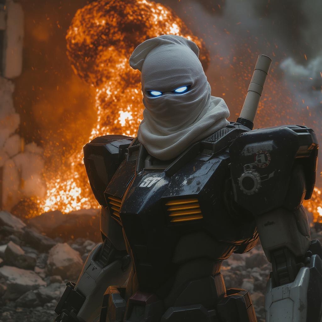 A cinematic scene featuring a gundam-inspired counter-terrorist from a popular video game, their face obscured by a white sheet with carefully cut eye holes. The setting is an intense warzone, with fiery explosions lighting up the background. The formidable RX-78 influence is evident in the figure's design, blending sleek futuristic armor with a realistic, gritty atmosphere. The mood captures the tension and drama of a battle-hardened soldier ready to defuse the chaos around them.