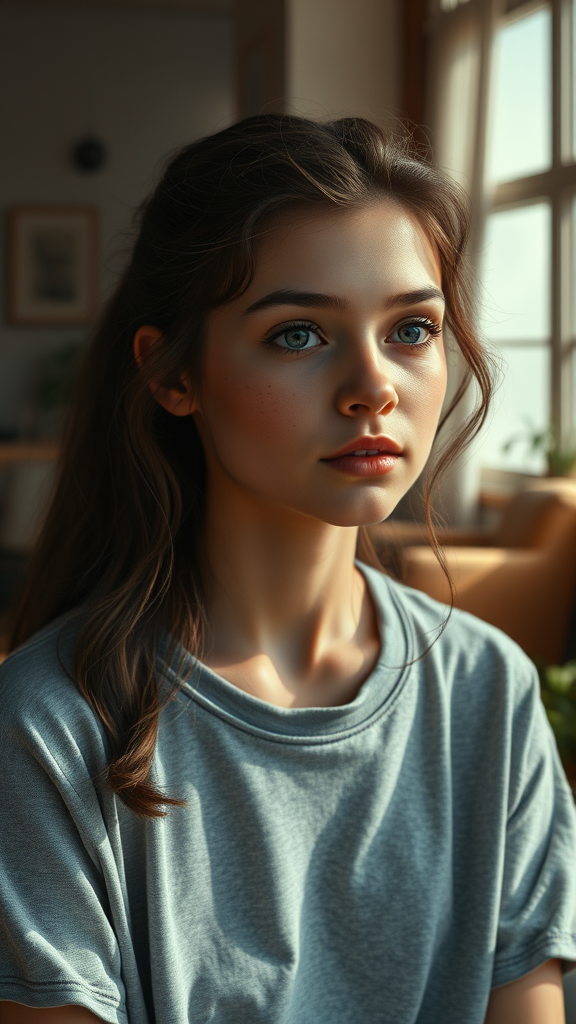 A cinematic scene featuring a pretty girl in a grey workout shirt, showcasing intricate details within an interior setting. The composition highlights muted colors and features freckles on the girl's face. The environment has a focus on clarity and harmony, avoiding poorly drawn elements, bad or wrong anatomy. The girl is portrayed with natural, well-proportioned limbs, seamlessly integrated into the scene, ensuring no disconnected limbs or mutations. The atmosphere is balanced, steering clear of anything ugly, disgusting, or blurry, and reflects a sense of organic beauty and realism.