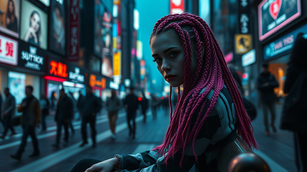 A cinematic scene in 4k ultra-realism captures a melancholic harlequin woman sitting on a weathered bench in a bustling cyberpunk city. Her eyes, heavy with dark liner, reflect a deep sadness. Glowing neon pink hair cascades in intricately braided strands, contrasting against the city’s dim ambiance. The background is alive with the movement of people, their silhouettes blurred in motion, creating a vivid tapestry of urban life. Flickering holographic ads cast a colorful, shifting light, enhancing the theatricality of the scene, as if time stands still for this solitary figure amidst the ephemeral city chaos, shot in a striking 9:16 aspect ratio.