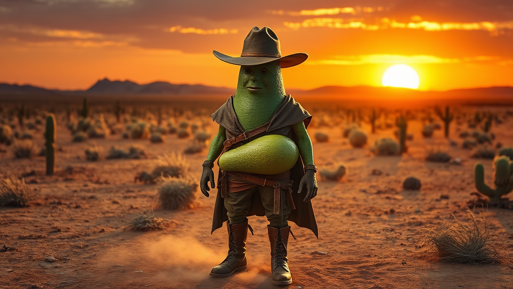 A cinematic scene of a lone desperado transformed into a humanoid avocado, standing amidst the dusty plains of the Wild West, the sun setting on the horizon casting long shadows. His avocado skin textured and bumpy, adorned with a wide-brimmed cowboy hat and rugged leather duster. The landscape is dry and arid, with cacti scattered across the terrain. Dust swirls around his worn boots as tumbleweeds roll by. The sky is a palette of warm oranges and purples, creating a stunning contrast with the deep green of his avocado form, captured in hyper-realistic, photographic detail, as if in 8k resolution.