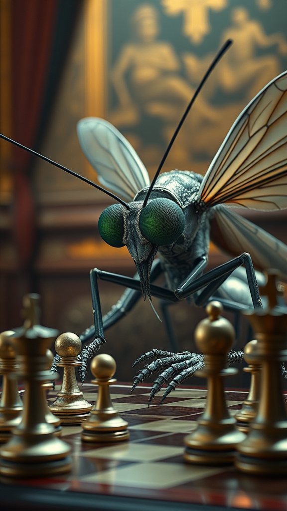 A cinematic scene of a mosquito with big green eyes, intricately detailed, and clad in gleaming armor, seated at a table playing chess. The portrait captures the subtle textures and colors of its delicate wings, reflecting the warm ambiance of a richly decorated room. Each chess piece is artfully sculpted, echoing the mosquito's world of nature and strategy, surrounded by an atmospheric glow that highlights the intensity of the match.