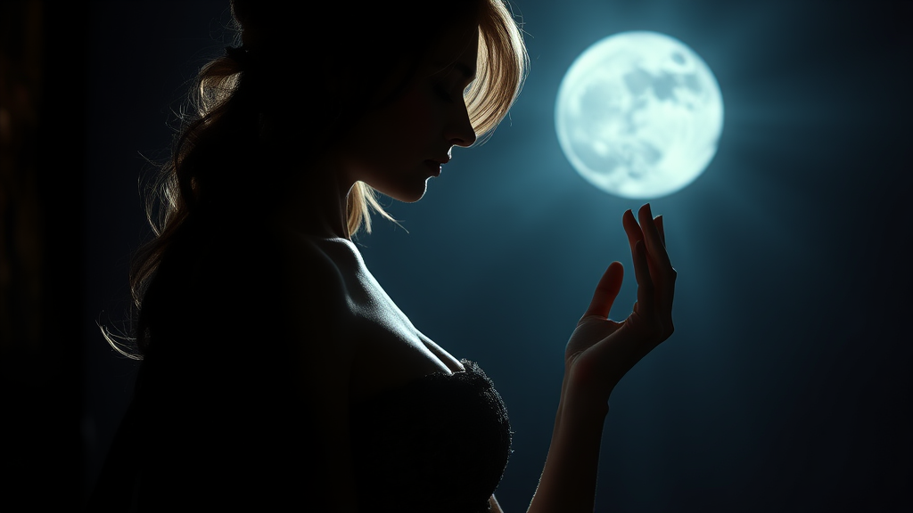 A cinematic scene reveals a woman with an elegant sweep of her neck, offering herself to a ravenous vampire silhouetted against the moonlight. Shadows drape across the room, accented by sharp, high-contrast lighting that enhances the eerie, atmospheric tension. Her skin glows with a pallid luminescence, capturing every fine detail in hyper-realistic, super-resolution clarity. The vampire's intense gaze locks onto her pulse with palpable hunger. Rich textures and depth are heightened by UHD, HDR, and 8K fidelity, creating a hauntingly beautiful tableau with a dramatic aspect ratio of 7:6.
