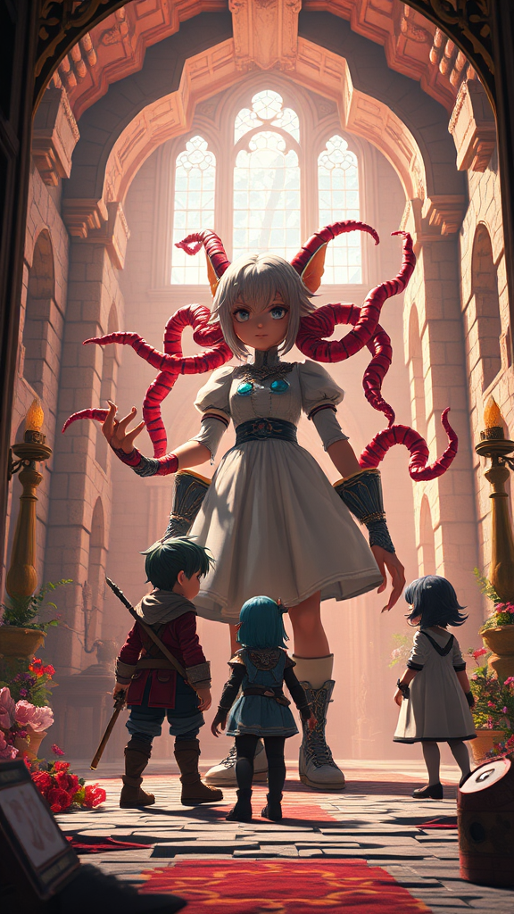 A cinematic shot capturing a fantasy scene in low resolution yet hyperdetailed pixel art, evoking a retro art style akin to Octopath Traveler. The interior background is designed in voxel style, showcasing a richly textured and clean aesthetic. The perspective, akin to a 100mm lens, frames the scene perfectly, highlighting vibrant contrasts and intricacies. Despite the fantasy theme, elements are intentionally exaggerated—characters display unique anomalies like elongated necks, and unusual limb formations, echoing a sense of mutation. The setting features a large central figure, reminiscent of a giant girl, accompanied by more than two characters in the scene. The overall composition has an intentionally deformed and disfigured aesthetic, with disjointed proportions, such as extra fingers and asymmetrical faces. The picture is presented within a thematic frame, capturing the essence of a retro fantasy world in UHD detail while embracing intentional grotesque artistry.