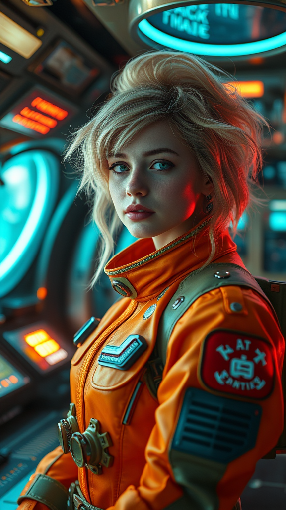 A cinematic shot capturing an intricately detailed steampunk spaceship interior; the scene centers on a cute girl with blonde, fluffy hair wearing a hyperdetailed orange and green steampunk fantasy space suit. The composition, shot with a 100mm lens, presents her in a dynamic pose with her upper body perfectly angled. Her face is meticulously detailed, accentuated by gloss lips. The setting is bathed in cinematic, studio, and volumetric lighting, with neon lights casting vibrant reflections across the space. Global illumination enhances the scene, producing soft shadows and vivid colors, with an intricate interplay of contrast and reflections that highlights the award-winning quality of this steampunk fantasy atmosphere.