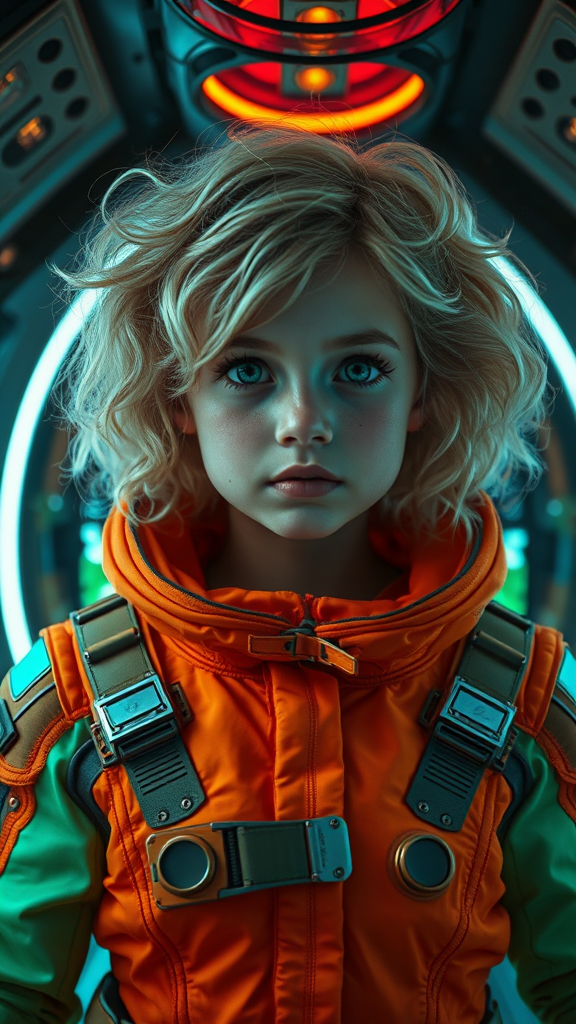 A cinematic shot capturing the upper body of a cute girl with blonde, fluffy hair in a hyperdetailed steampunk spaceship interior. She is centered perfectly, with a dynamic pose, wearing an intricately designed orange and green steampunk fantasy space suit. Her face is hyperdetailed with glossed lips showing subtle emotion. The scene is illuminated with a blend of cinematic, volumetric, and studio lighting, creating a stunning neon reflection. The use of a 100mm lens offers a perfect angle that highlights the contrast between soft shadows and vivid colors, achieving a sense of global illumination. The neon lights add an electrifying ambiance, creating a visual masterpiece rich in texture and detail, capturing the essence of award-winning photography.