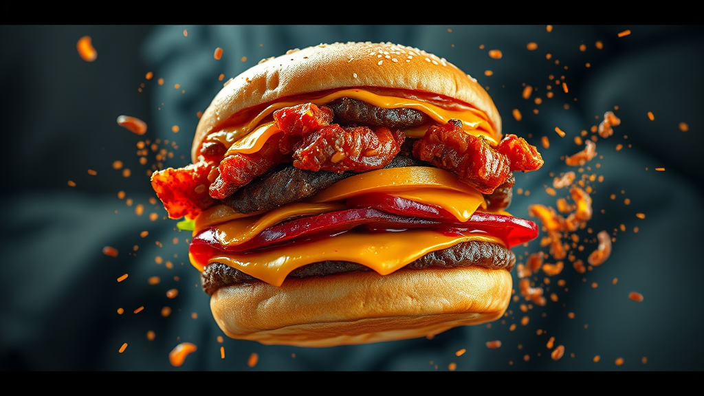 A cinematic shot of a burger bursting apart in mid-air, capturing the essence of juicy, flavorful, and hot ingredients in exquisite detail, enhanced with Adobe Lightroom for rich textures and vibrant contrast, showcasing intricate layers and mouthwatering appeal, designed for promotional excellence.