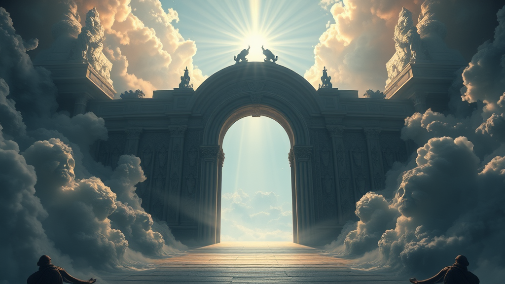 A cinematic shot of the gates to heaven, fully detailed and rendered in 8k resolution, showcasing a realistic and atmospheric scene. Styled by the influence of Ivan Aivazovsky, Peter Mohrbacher, and Greg Rutkowski, the image incorporates a volumetric light effect with broad, radiant beams. The scene blends the elegance of oil painting and fantasy art with sci-fi elements, creating a sense of realism and awe. The view is reminiscent of a premium print, as if conceived in the Unreal Engine, offering a visionary glimpse into a celestial realm with ethereal beauty.