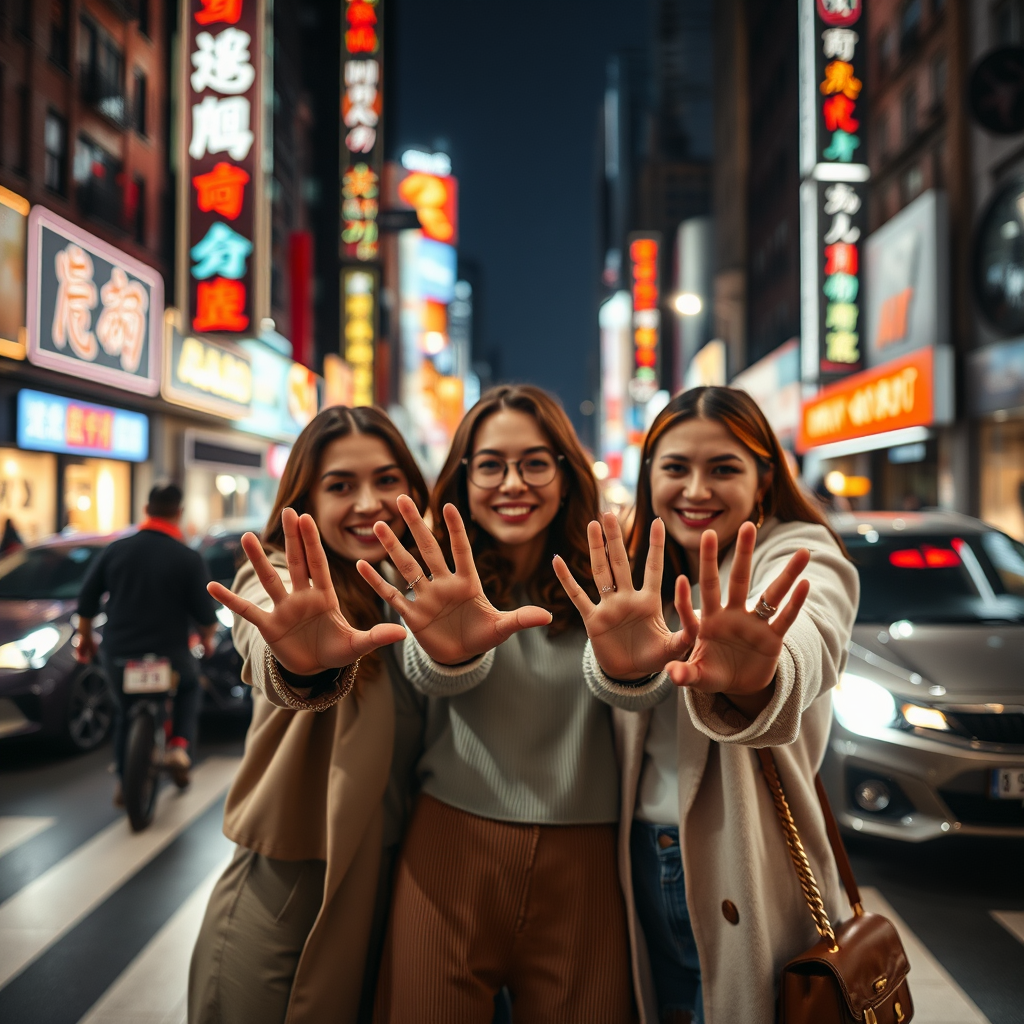 A cinematic shot of three women standing close together on a bustling city street, their hands extended playfully towards the camera. Behind them, the blurred outlines of neon signs and fast-moving traffic paint a lively urban backdrop. Each woman wears a unique expression, from excitement to curiosity, as their fingers catch the soft glow of streetlights, adding a touch of warmth to the cool night air.