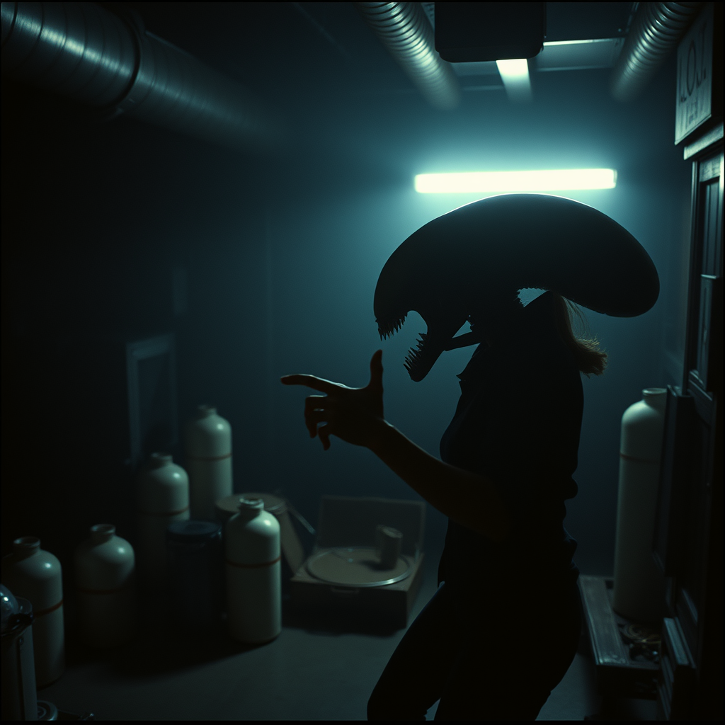 A cinematic shot reminiscent of Ridley Scott's "ALIEN" captures the intense confrontation between Ellen Ripley, played by Sigourney Weaver, and a menacing alien. Ripley is frozen mid-scream, attempting to escape the alien's grasp, her fear palpable. Behind them, a dimly lit, industrial setting reveals scattered equipment, including oxygen tanks. The room is engulfed in shadows, with dark, moody lighting casting dramatic highlights and enhancing the film noir atmosphere. Shot with a Sony ALPHA 7R V, the image exudes a raw, gritty film aesthetic, blending high resolution detail with a classic cinematic look in a wide aspect ratio.