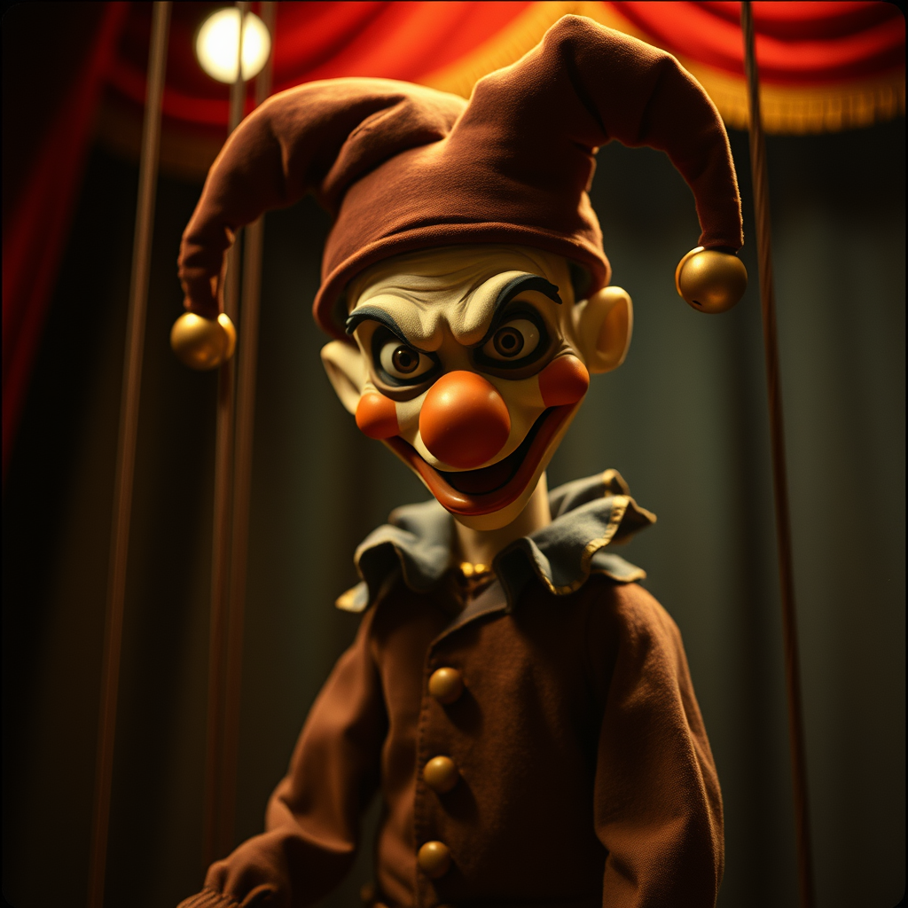A cinematic still portrait of a Puppet of Jester with mischievous eyes, inspired by Tim Burton's unique style. The puppet dons a traditional Fool's outfit, complete with a cap 'n' bells hat, and stands on a puppet theater stage. This scene is captured in a portrait shot with dramatic, cinematic lighting using a 1970's Leica M3 rangefinder camera, paired with a Summicron 35mm lens. With a wide aperture set at f2, an ISO of 600, and a shutter speed of 1/50, this image is shot on vibrant 1970s Kodak color film. The eye-level close-up highlights the puppet's expressive features and puppet style, all within a cinematic and dramatic light setting. The overall composition avoids poor quality, text, signatures, or visual artefacts.