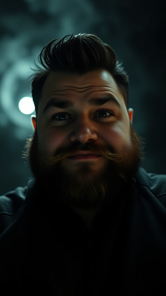 A cinematic three-quarter close-up portrait of a strikingly handsome 30-year-old man with an overweight build and a captivating face, exuding a curious and friendly expression. His appearance is complemented by a well-groomed, full beard and neatly styled hair. The background is oppressive and contrasting, with a dramatic and expressive atmosphere of gloom and horror. The scene is backlit from within, creating a crushing ambiance. Photographed from a low angle with a DSLR, this hyper-realistic image features an aperture of f/7, a shutter speed of 1/100 sec, and an ISO of 150, capturing intricate details and natural reflections. Despite the setting's intense and dramatic lighting, the shot remains clear and detailed, avoiding any distracting elements like poor anatomy or low-quality visuals. The composition maintains symmetry and focus on the subject, ensuring the character's calm and welcoming demeanor contrasts vividly with the tumultuous background.