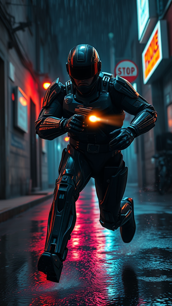 A cinematic ultra-wide shot captures a cyborg police agent engaged in a high-stakes gunfight, epitomizing the iconic RoboCop aesthetic. He has advanced cybernetic limbs and dons a sleek helmet with a reflective visor, sprinting dynamically as bullets whiz past him. The scene is charged with motion and blur, set against a backdrop of a rain-soaked, desolate dark alleyway, illuminated by vibrant neon lights. Wisps of smoke swirl through the air, enhanced by dramatic, cinematic lighting. The extreme wide shot showcases hyper-realism and intricate detail, embodying trans-humanism and cyberpunk elements, set in a hyper-futuristic world reminiscent of the 1980s. Filmed in the style of Paul Verhoeven, the shot excludes mockup, bad anatomy, text, signature, watermark, username, low resolution, worst quality, low quality, jpeg artifacts, blur, and poor framing.