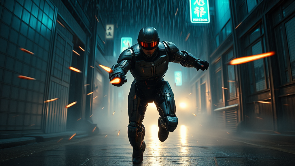A cinematic ultra-wide shot of a cyborg police agent reminiscent of RoboCop in an intense gunfight. His cybernetic limbs are showcased as he dashes forward in a dynamic pose, with a visor-covered helmet reflecting the chaos. Bullets streak through the air around him, creating a sense of frenetic movement and urgency. It's raining heavily, with the scene set in a desolate, dark alleyway illuminated by flickering neon lights. Smoke drifts through the scene, enhancing the dramatic cinematic lighting. This extreme wide shot captures hyper-realistic and highly detailed elements, embracing themes of trans-humanism and cyberpunk aesthetics. The scene exudes a hyper-futuristic vibe with a nostalgic nod to the style of the 1980s, as if directed by Paul Verhoeven. The emphasis is on high-quality imagery, with meticulous attention to framing and composition, avoiding any elements of poor quality or visual distraction.