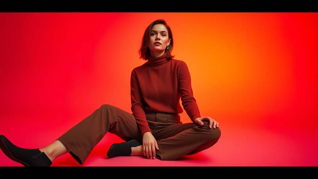 A cinematic, wide-angle fashion photograph for the brand Uniqlo features a woman elegantly seated on the floor, showcasing a Uniqlo HeatTech top paired with stylish brown chinos. The background is a smooth gradient of warm hues, transitioning from deep red through soft pink to radiant orange, creating an inviting studio setting that highlights the essence of the outfit.