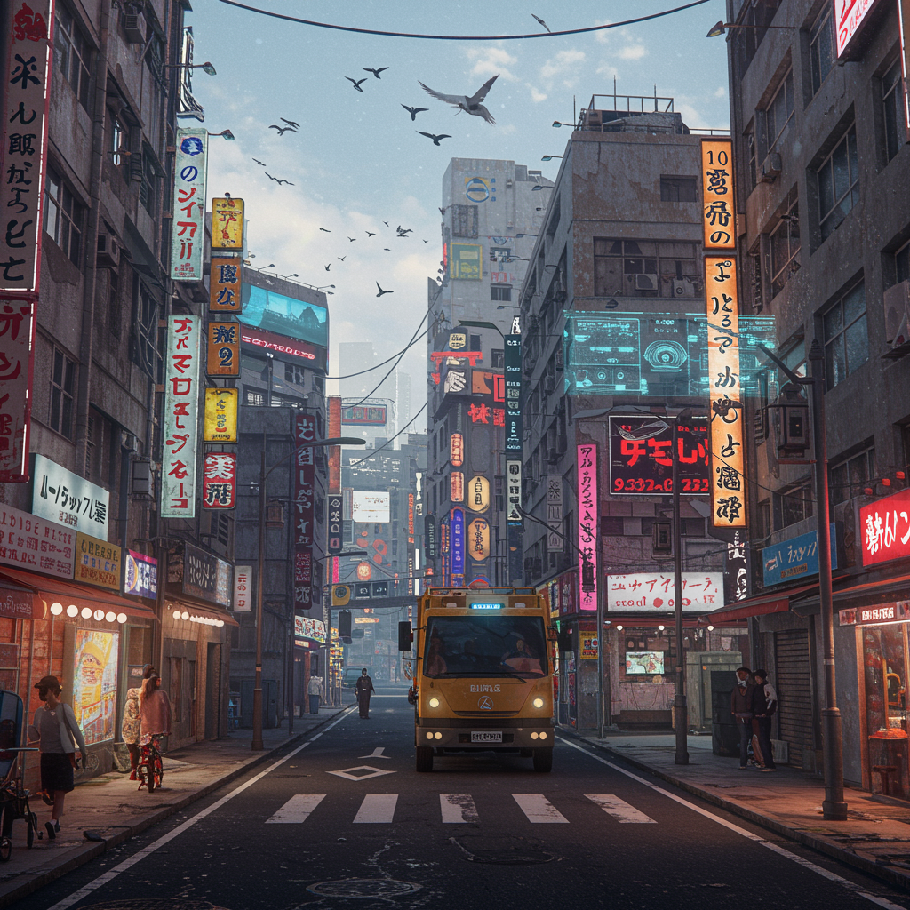 A cinematic wide, static shot of a bustling street in a Tokyo-inspired cityscape. The buildings are slightly weathered yet adorned with futuristic touches, including vibrant neon signs and flickering holographic ads. A group of birds arcs gracefully across the sky as an electric garbage truck hums quietly along the pavement. The air carries a faint hum of technology interspersed with distant chatter, creating a rich urban tapestry.