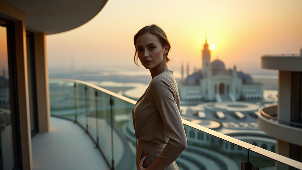 A Cinestill Hasselblad 85mm camera captures an image through the lens of timeless elegance and modern allure. The scene features a poised woman with an air of sophistication, standing gracefully on a balcony that offers a breathtaking vista of Dubai's skyline. The sun dips below the horizon, casting a golden hue across her face and the surrounding architecture, creating a canvas of warmth and depth. Her stance exudes confidence and resolve, poised to embrace whatever challenges await her. In the distance, the silhouette of a grand villa hints at mystery, perhaps a clandestine hideaway of intrigue. The photograph, impeccably crisp and richly detailed, is rendered in vivid 8k resolution, offering a cinematic allure that draws viewers into its narrative. With photorealistic precision and a hyper-detailed aesthetic, the analog style captures every nuance—soft lighting, the gentle play of shadows, and the finely textured matte skin. The masterpiece of film photography, steeped in the principles of the Golden Ratio, emphasizes her presence with intricate detail and artistry, devoid of any modern distractions or imperfections.