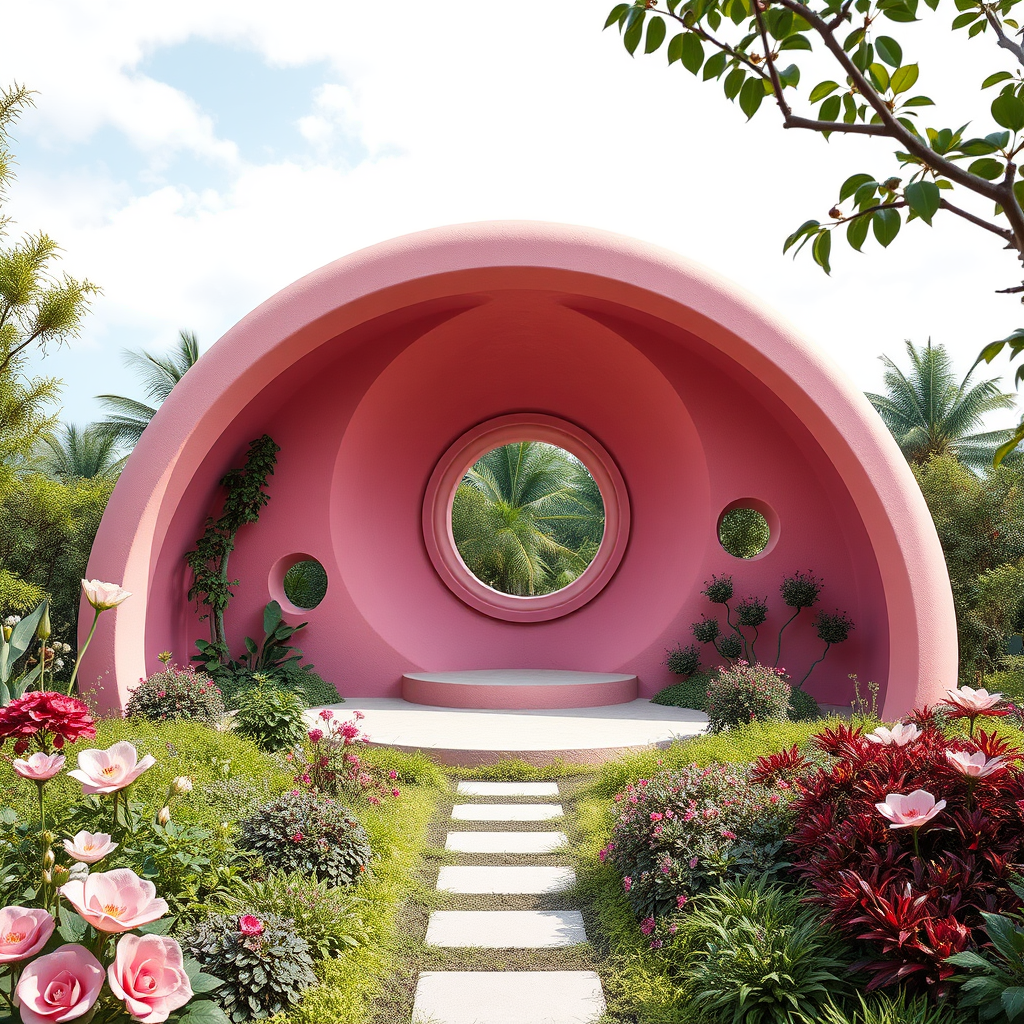 A circular rose-hued structure featuring an orb-shaped window at its core, surrounded by blush arches, embodies a psychedelic architectural marvel. This vibrant, biomorphic temple sits within a surreal garden, echoing the style of Verner Panton with its vegetal influences. It captures a pink zen aesthetic, harmonizing with nature as an outdoor art installation. The captivating design boasts high-quality architectural artistry, with graceful geometric arcs carved from rose-toned concrete. This organic architecture is envisioned by Lee Loughridge, presenting an exquisite aesthetic that blends the delicate curves of nature with the fluidity of innovative design.