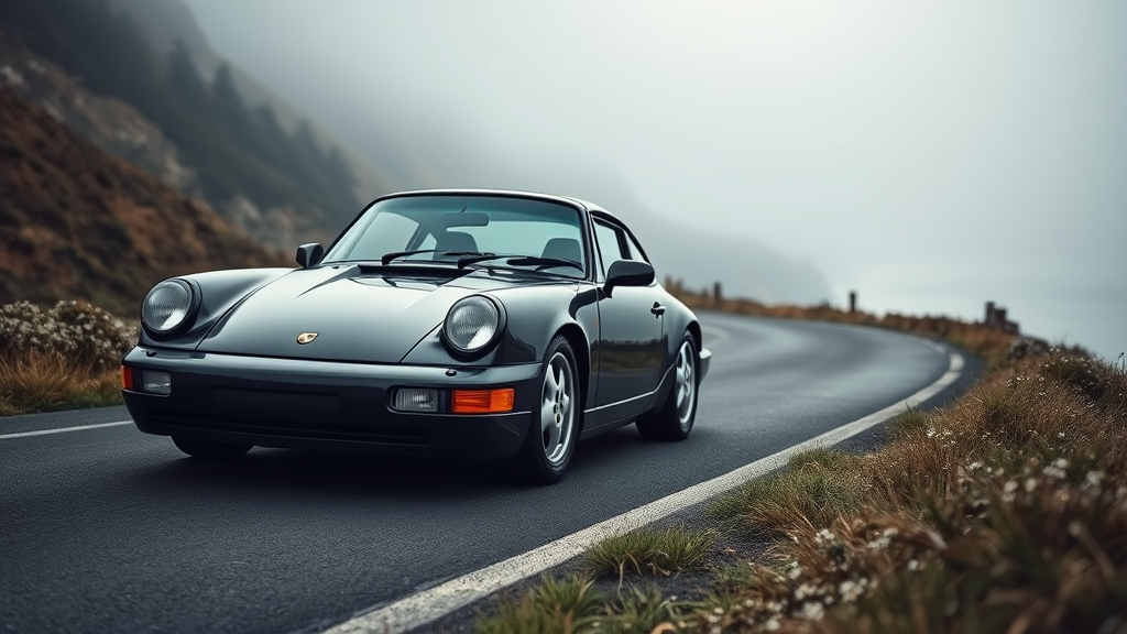 A classic 1995 Porsche 911, timeless and elegant in black with silver accents, navigates an early morning journey along a winding road in a coastal mountain range. The scene is enveloped in misty fog, with the dewy grass glistening softly. Captured in moody editorial photography with a vintage flair, the image showcases the car's pristine condition and superb quality. Echoing the style of renowned photographer Jeff Zwart, this realistic 4K composition highlights the beauty of classic cars against a captivating natural backdrop. The atmosphere is serene yet invigorating, as the iconic vehicle commands attention amidst its scenic surroundings. Tags: Realistic, superb quality, 4K, classic cars, Porsche 911, editorial photography.