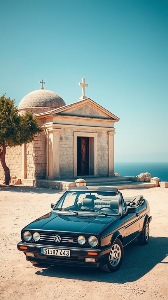 A classic black Volkswagen Golf convertible parked in front of an ancient stone Greek chapel on a sun-drenched, deserted island, enhanced by an analog grain for a nostalgic feel, on a sweltering summer day, under the endless clear blue skies, capturing the essence of wanderlust and timeless travel photography.