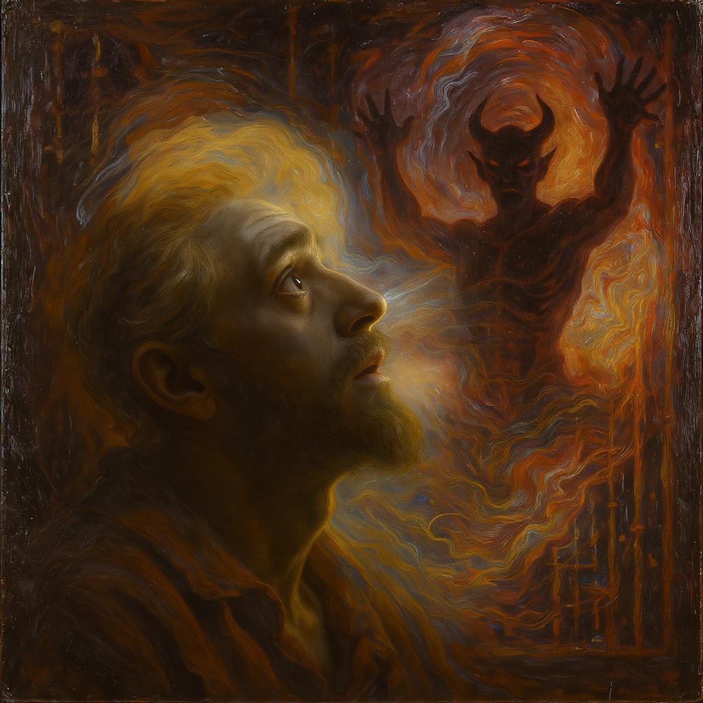 A classic oil painting depicting a man gazing into the matrix, witnessing the presence of the Devil amidst a vivid DMT hallucination, rendered in the style of Diego Velásquez with alla prima technique. The man's expression is one of awe and tension as swirling, surreal colors envelop the scene, blending reality with the abstract. Shadows and light play dramatically across his face, enhancing the surreal atmosphere and creating a juxtaposition between the ethereal vision and the dark, mysterious presence.