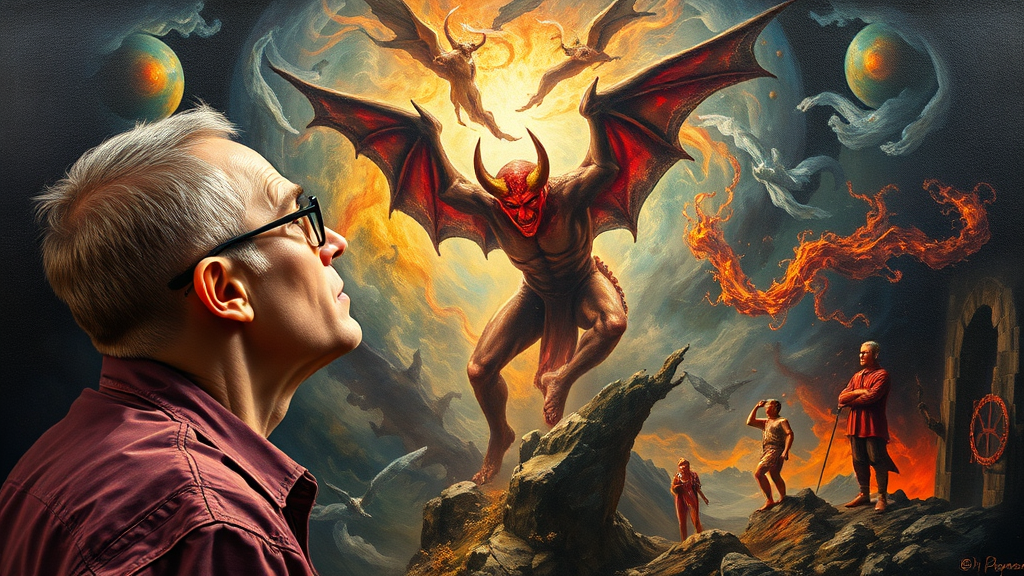 A classic oil painting depicting a man gazing into the matrix, unveiling a vision of the Devil amidst a swirling DMT hallucination. The style is reminiscent of Diego Velasquez, capturing the scene in rich, textured brushstrokes, alla prima. The composition is surreal and intricate, combining ethereal figures with vivid, dreamlike landscapes to evoke a sense of wonder and awe.
