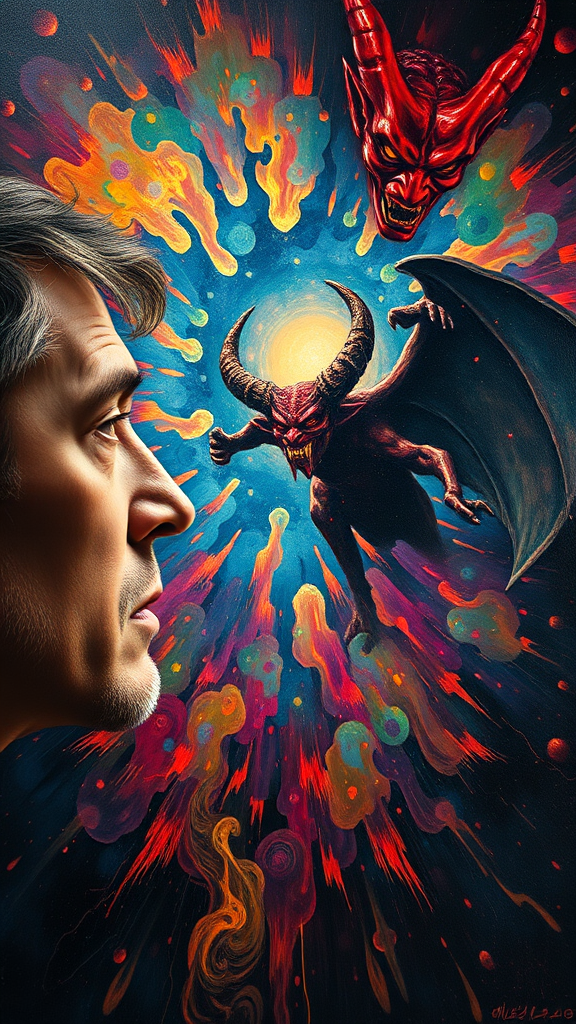 A classic oil painting depicting a man gazing through a shimmering, abstract matrix, revealing an encounter with a devilish figure amidst a kaleidoscope of vivid, swirling colors reminiscent of a DMT vision. The artwork captures the essence of Diego Velasquez's style, with rich textures and dramatic chiaroscuro. The man's expression portrays a mix of awe and terror, as the devil, with intricate details and a slightly surreal twist, emerges from the vibrant chaos, enveloped in a mystical, dreamlike atmosphere.