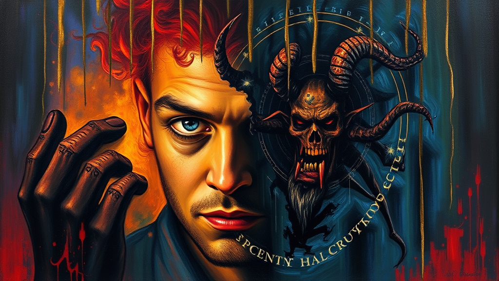 A classic oil painting featuring a man peering into the depths of the matrix, his eyes catching the sinister glance of the Devil amidst a swirling DMT hallucination, painted with bold, expressive strokes in an alla prima technique reminiscent of Diego Velasquez. The canvas captures a surreal blend of vivid colors and shadowy figures, creating an enigmatic and dreamlike atmosphere that bends reality, with a composition emphasizing the juxtaposition of ethereal visions and dark, brooding elements in a vertical orientation.