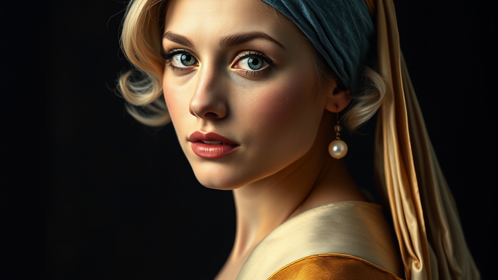 A classic portrait of a modern-day Marilyn Monroe, captured in the iconic style of Vermeer’s The Girl with a Pearl Earring. She is elegantly dressed in a vintage silk gown with a delicate sheen, reminiscent of timeless Hollywood glamour. Her luminous skin is softened by the warm, subtle play of light and shadows, accentuating her enigmatic expression. A gleaming pearl earring adorns her ear, contrasting against her platinum blonde curls, embodying both mystery and allure. The background is a rich, dark tapestry that enhances the focus on her captivating gaze, inviting the viewer into a world where old-world charm meets contemporary elegance.