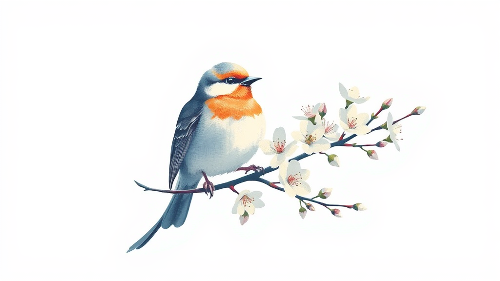 A classic vintage t-shirt design featuring an abstract, serene bird perched on a blossoming branch, captured in high definition. The artwork exudes a timeless and classical vibe, reminiscent of a Don Martin creation, with a subtle gradient of blue edging against a pristine white background. Add whimsical touches to the bird's feathers and blossoms, enhancing the ethereal and tranquil atmosphere of the composition.