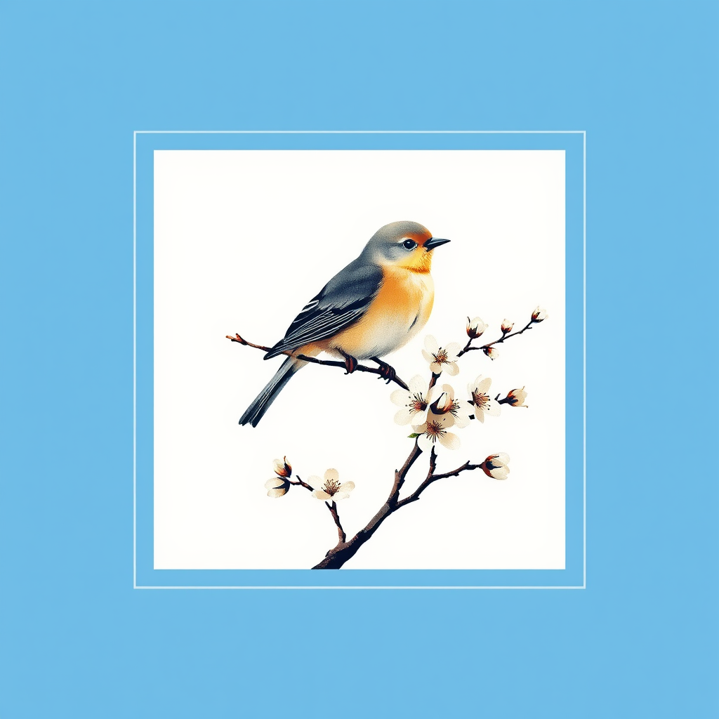 A classical vintage T-shirt design featuring an abstract depiction of a serene bird perched on a blossoming branch, with subtle influences from Don Martin. The image is framed by a gradient blue edge against a pristine white background, evoking a timeless and ethereal aesthetic. The artist's playful yet sophisticated style shines through in the intricate details and harmonious balance of elements.