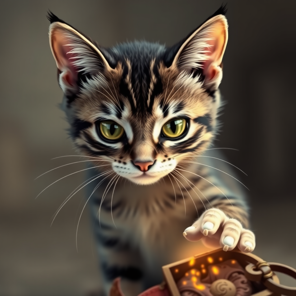 A clever and mischievous feline with knowing eyes and a sleek coat, poised as if ready to pounce on a hidden treasure, exuding an air of playful mystery and cunning intelligence.