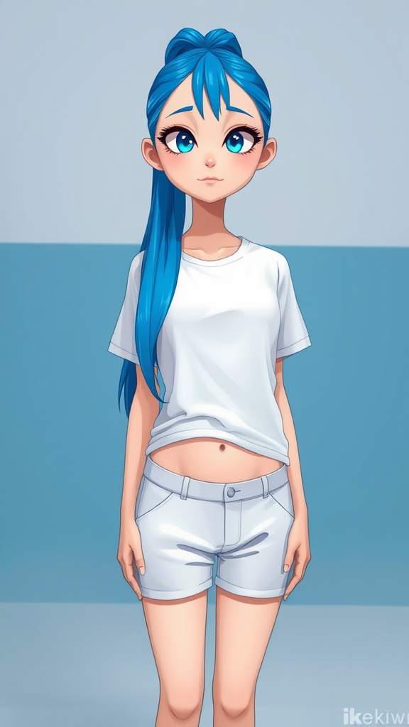 A cloned, mutated 1girl stands in a white and blue themed setting, wearing a white T-shirt and shorts. Her long, blue ponytail extends from the back of her head. Her face has a duplicate mutation, with identical, crossed eyes. The rest of her body appears relatively normal, showing medium-sized breasts and a navel visible above the waistband of the shorts. The overall quality is set at 8k, UHD, and HDR, but is badly distorted with lowres formatting and jpeg artifacts. The image is watermarked with a logo composed of letters and words, and appears cropped. A cartoonish effect is applied, giving the image a comical appearance, and it comes in duplicate as a split image.