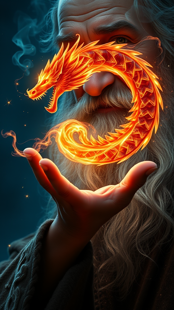 A close-up, cinematic painting of Gandalf the Grey from the chest up, with an intimate crop that captures his wise and warm eyes, a gentle hint of a smile playing on his lips. His hand is raised, fingers slightly curled, as he conjures an ethereal dragon made of shimmering fire and smoke above his palm. This dragon is intricately detailed, its body alive with vibrant, swirling flames and delicate, smoky wisps, gracefully coiling in mid-air. Each scale flickers with a fiery glow, pulsing in hues of deep orange, crimson, and gold, while its intense eyes and open jaws release tiny sparks that cast a warm, dynamic light on Gandalf's face and hand. The background is a rich, deep blue, enhancing the dragon's vivid luminescence. The scene is illuminated by soft, volumetric lighting that adds depth and atmosphere, accentuated by magic dust particles floating in the air. The dragon's smoke and fire seamlessly blend, leaving shimmering trails like sparkler remnants, adding movement and awe to the scene. The rendering style is hyperrealistic and finely detailed, emphasizing soft shadows and complex, diffused lighting. Gandalf’s robes and hand are bathed in the dragon's warm glow, with textures highlighted by light and shadow contrast, capturing an enchanting moment of magic with lifelike precision, creating a mystical and cinematic ambiance.