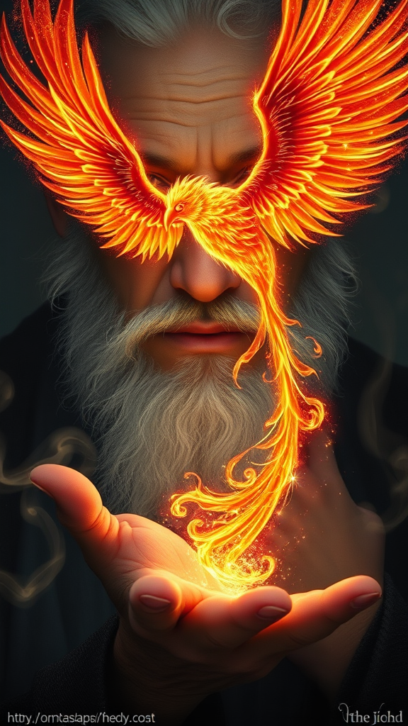 A close-up, cinematic painting of Gandalf the Grey, captured from the chest up with an intimate focus. He gazes directly into the viewer's eyes, a gentle smile hinting at his lips, exuding wisdom and warmth. His open hand, fingers slightly curled, conjures a luminous, fiery phoenix made entirely of fireworks and smoke, hovering just above his palm. The fireworks phoenix is intricately detailed, its form composed of vivid, swirling fire and delicate smoky tendrils. The phoenix appears alive, its wings spreading gracefully in mid-air, each feather flickering with a fiery glow that pulsates in shades of deep red, golden amber, and bright orange. Its eyes blaze intensely, and its open beak releases tiny sparks, casting a warm, ever-shifting light that illuminates Gandalf’s face and hand. Elegantly curling trails of smoke rise from its wings and tail, mingling with the surrounding air to give it an ethereal, ghostly presence. The background is a rich, midnight blue, fading into shadow to allow the glowing phoenix to stand out vividly. Soft, volumetric lighting envelops Gandalf’s hand and the phoenix, enhancing depth and atmosphere as light reflects off floating particles of magic dust. The phoenix’s fire and smoke seamlessly merge, leaving shimmering trails that swirl away like the remnants of a sparkler, infusing the scene with movement and wonder. The rendering style is hyperrealistic, with an emphasis on intricate details, soft shadows, and complex, diffused lighting. Gandalf’s robes and hand are warmly lit by the phoenix's glow, with subtle textures highlighted by contrasting light and shadow. The painting captures a mesmerizing moment of magic, where every flicker of the phoenix's fiery form and every curl of smoke is rendered with exquisite, lifelike precision, creating a scene that feels both mystical and deeply cinematic.