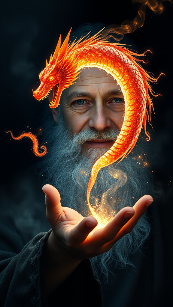 A close-up, cinematic painting of Gandalf the Grey, captured from the chest up with an intimate crop. He gazes directly at the viewer, a gentle smile gracing his features, exuding warmth and wisdom. His hand is raised, fingers slightly curled as he conjures an ethereal dragon made entirely of fireworks and smoke above his palm. The dragon is intricately detailed, its form a blend of vibrant fire and airy wisps. It coils gracefully in mid-air, each scale flickering with bright hues of orange, crimson, and gold. Its eyes are intense, open jaws emitting tiny sparks that illuminate Gandalf's face and hand with a warm glow. Trails of smoke spiral from its wings and tail, fading into the air with an ephemeral, ghostly quality. The backdrop is a deep, dark blue, transitioning into shadow to make the radiant dragon stand out. Soft, volumetric lighting envelops Gandalf's hand and the dragon, creating depth and atmosphere with light reflecting off sparkling magic dust in the air. The dragon's smoke and flame meld smoothly, with its tail and wings leaving shimmering trails that resemble the aftermath of a sparkler, infusing the scene with motion and wonder. Rendered in a hyperrealistic style, the scene emphasizes soft shadows and complex lighting, with Gandalf's robes and hand bathed in the dragon's warm glow. Subtle textures are highlighted by the interplay of light and shadow, capturing an enchanting moment of magic with lifelike precision, where every flicker and tendril of smoke is exquisitely detailed, creating a mystical and cinematic scene.