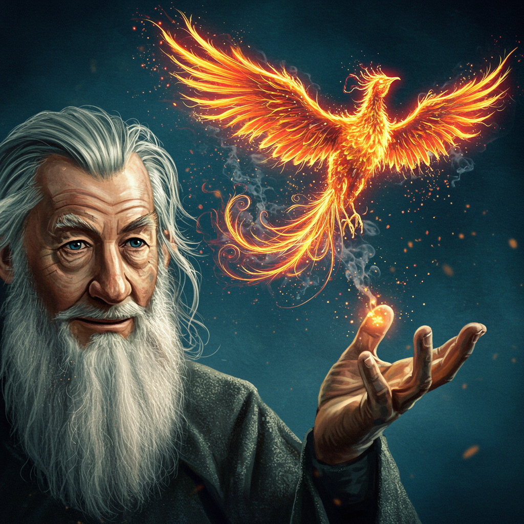 A close-up, cinematic painting of Gandalf the Grey, captured from the chest up with a focused, intimate crop. He gazes directly into the viewer's eyes, a gentle, knowing smile playing across his lips, exuding an aura of wisdom and warmth. His hand is raised and open, fingers slightly curled as he conjures an ethereal, fiery phoenix made entirely of fireworks and smoke that hovers just above his palm. The fireworks phoenix is brilliantly detailed, its form composed of vibrant, swirling fire and faint, smoky wisps. The phoenix appears to be alive, its wings gracefully spread mid-flight, each feather flickering with a fiery glow that pulses in shades of deep orange, crimson, and gold. Its eyes burn intensely, and its open beak releases tiny sparks, casting a warm, shifting light that illuminates Gandalf’s face and hand. Delicate trails of smoke spiral off its wings and tail, fading into the surrounding air, giving it an ephemeral, almost ghostly quality. The background is a rich, dark indigo, fading into shadow to allow the glowing phoenix to stand out vividly. Soft, volumetric lighting surrounds Gandalf’s hand and the phoenix, creating a sense of depth and atmosphere as light reflects off particles of magic dust floating in the air. The phoenix’s smoke and fire blend seamlessly, with its tail and wings leaving shimmering trails that drift away like the remnants of a sparkler, adding movement and a sense of awe to the scene. Rendering Style: Hyperrealistic and finely detailed, with an emphasis on soft, realistic shadows and complex, diffused lighting. Gandalf’s robes and hand are lit by the warm glow of the phoenix, with subtle textures emphasized by the contrast of light and shadow. The painting captures an enchanting moment of magic, where every flicker of the phoenix's fiery form and every tendril of smoke is rendered with exquisite, lifelike precision, creating a scene that feels both mystical and deeply cinematic.