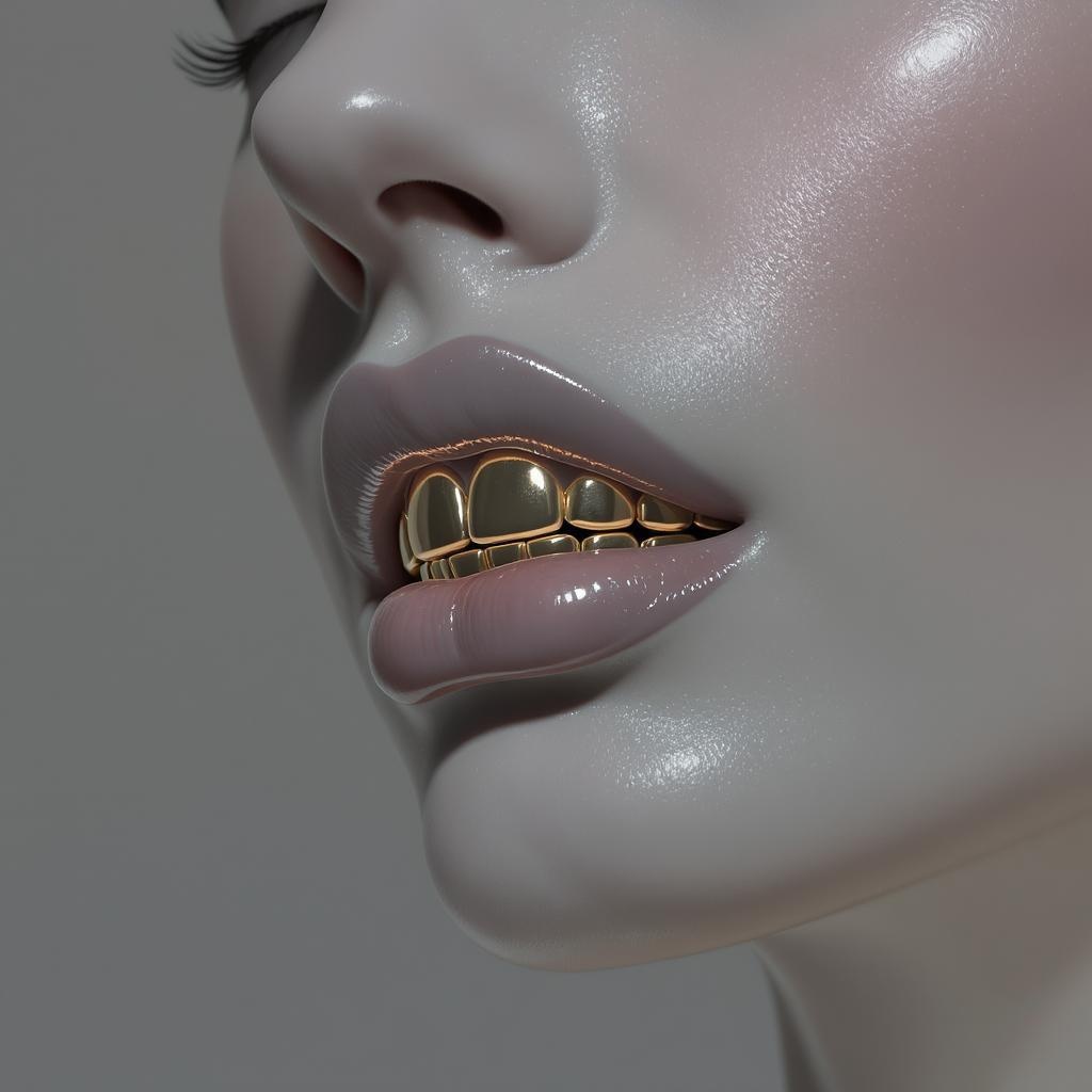 A close-up depiction of a woman with a prominent jawline and shimmering gold teeth, captured in a futuristic minimalism style. The composition highlights restrained forms with an air of dark romanticism, reminiscent of the Bechers' typologies. The scene features a glossy finish and intricate details, showcasing the interplay of light and shadow on her features. Ethereal undertones and subtle textures create a harmonious balance, evoking a sense of mystique and allure. The imagery is both striking and elegant, presented within a 4:5 aspect ratio.