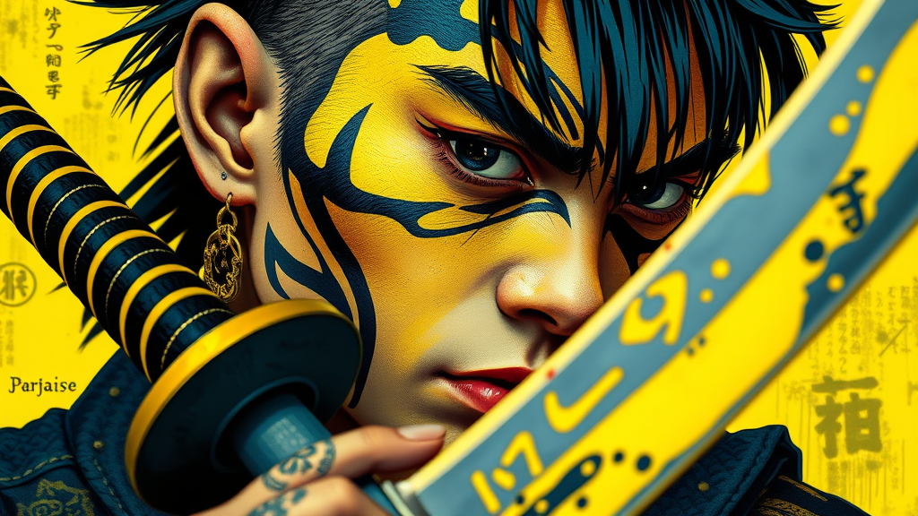A close-up editorial photograph of a gothic punk rebel Japanese individual, with striking neon yellow and black tattoos, wielding a katana. The image exudes anime art influence, showcasing expressive textural quality and photo-realistic techniques. The vibrant and colorful palette reflects the essence of hurufiyya, captured in 32k UHD. The artwork reveals fluid dynamic brushwork with realistic hyper-detailed portraits, emphasizing sharp angles and hard-edged painting. It channels the timeless aesthetic of ukiyo-e. The overall effect is stunningly beautiful, blending raw style elements for a unique visual experience.